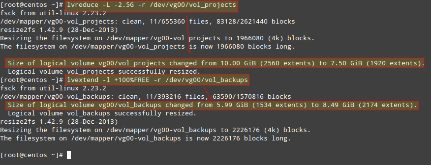 # lvreduce -L -2.5G -r /dev/vg00/vol_projects # lvextend -l +100%FREE -r /dev/vg00/vol_backups