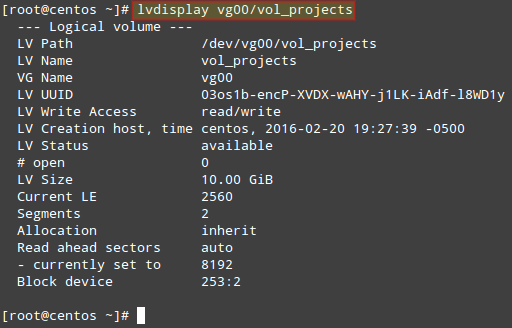 # lvcreate -n vol_projects -L 10G vg00 # lvcreate -n vol_backups -l 100%FREE vg00