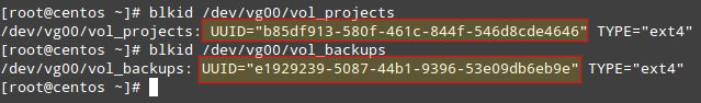 # blkid /dev/vg00/vol_projects # blkid /dev/vg00/vol_backups