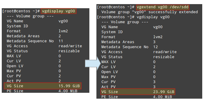 如果你在运行上条命令的前后执行 vgdisplay vg00 ,你就会看出 VG 的大小增加了。