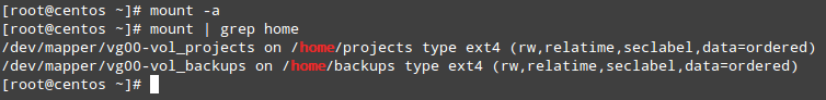 # mkfs.ext4 /dev/vg00/vol_projects # mkfs.ext4 /dev/vg00/vol_backups