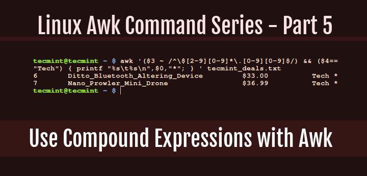 # awk '($3 ~ /^\$[2-9][0-9]*\.[0-9][0-9]$/) && ($4=="Tech") { printf "%s\t%s\n",$0,"*"; } ' tecmint_deals.txt 6 Ditto_Bluetooth_Altering_Device $33.00 Tech * 7 Nano_Prowler_Mini_Drone $36.99 Tech *
