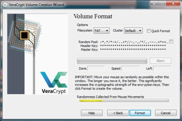 要有效工作,VeraCrypt 要从一个熵或者“随机数”池中取出一个随机数。要初始化这个池,你将被要求随机地移动鼠标一分钟。一旦进度条变绿了,或者更方便的是等到进度条到了屏幕右边足够远的时候,点击 “ 格式化 ” 来结束创建加密盘。