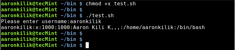 运行脚本后,它会提示你输入一个用户名,然后你输入一个合法的用户名并回车。你将会看到来自 /etc/passwd 文件中详细的用户账户信息,如下图所示: