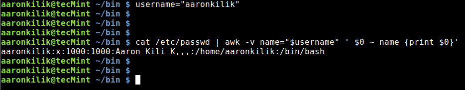 # cat /etc/passwd | awk -v name="$username" ' $0 ~ name {print $0}'