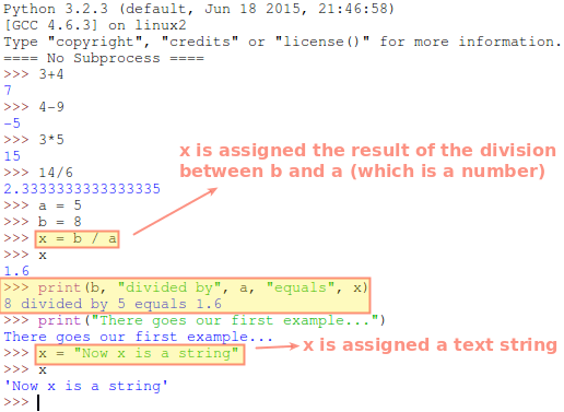 >>> a = 5 >>> b = 8 >>> x = b / a >>> x 1.6 >>> print(b, "divided by", a, "equals", x)