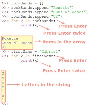 >>> rockBands = [] >>> rockBands.append("Roxette") >>> rockBands.append("Guns N' Roses") >>> rockBands.append("U2") >>> for x in rockBands: print(x) 或 >>> firstName = "Gabriel" >>> for x in firstName: print(x)