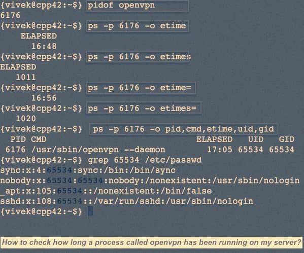 PID CMD ELAPSED UID GID 6176 /usr/sbin/openvpn --daemon 15:25 65534 65534