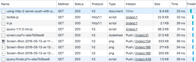 访问本文时,通过 Chrome 的开发者工具,我们可以轻松的验证网站是否正在使用服务器推送技术(LCTT 译注: Chrome 版本至少为 53)。在“Network”选项卡中,我们可以看到有些资源的“Initiator”这一列中包含了Push字样,这些资源就是服务器端推送的。