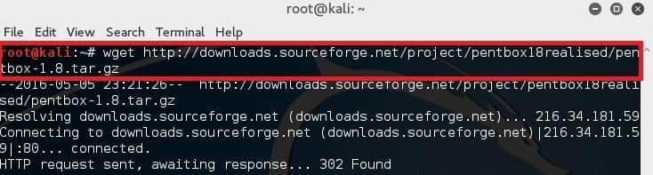 root@kali:~# wget http://downloads.sourceforge.net/project/pentbox18realised/pentbox-1.8.tar.gz