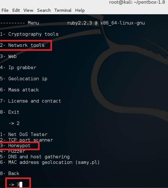 使用选项 2 (Network Tools) 然后是其中的选项 3 (Honeypot)。