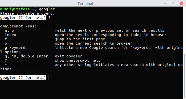 交互界面就会被打开,Googler 的开发者 Arun Prakash Jana 称之为 全向提示符 ,你可以输入 ? 去寻找可用的命令参数: