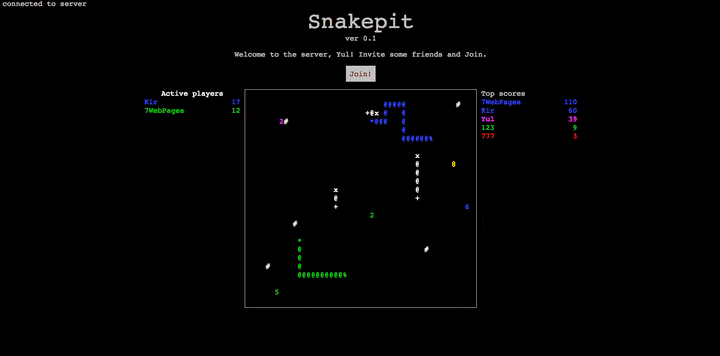 注意玩家连接上服务端后不是立马加入游戏。连接开始时是 观望者 模式,玩家可以观察其它玩家如何玩游戏。如果游戏已经开始或者上一个游戏会话已经在屏幕上显示 “game over” (游戏结束),用户此时可以按下 “Join”(参与),来加入一个已经存在的游戏,或者如果游戏没有运行(没有其它玩家)则创建一个新的游戏。后一种情况下,游戏区域在开始前会被先清空。