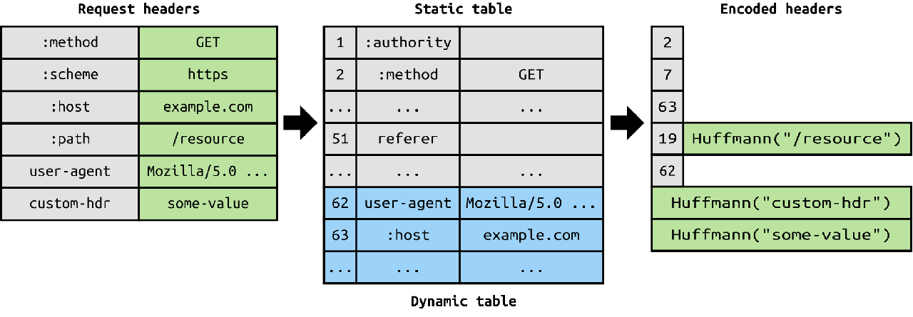 不像请求和响应那样,头信息中的信息不会以 gzip 或者 compress 等格式压缩。而是采用一种不同的机制来压缩头信息,客户端和服务器同时维护一张头信息表,储存了使用了哈夫曼编码进行编码后的头信息的值,并且后续请求中若出现同样的字段则忽略重复值(例如 用户代理 等),只发送存在两边信息表中它的引用即可。