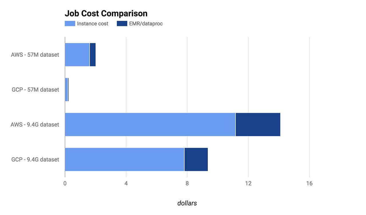 本文依据构建时间和运营成本对 AWS 和 GCP 的 Spark 工作负载作一个简短比较。实验由我们的学生在 数据孵化器 进行, 数据孵化器 是一个大数据培训组织,专门为公司招聘顶尖数据科学家并为公司职员培训最新的大数据科学技能。尽管 Spark 效率惊人,分布式工作负载的时间和成本亦然可以大到不能忽略不计。因此我们一直努力寻求更高效的技术,以便我们的学生能够学习到最好和最快的工具。