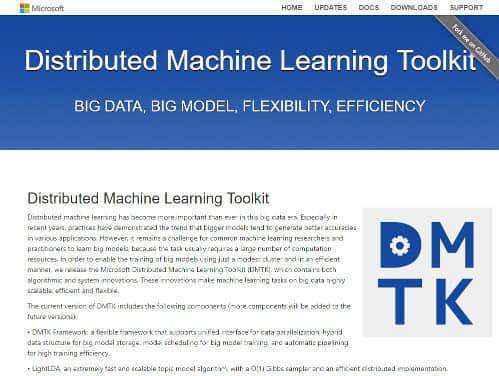 DMTK 是 分布式机器学习工具 的缩写,和 CNTK 一样,是微软的开源人工智能工具。作为设计用于大数据的应用程序,它的目标是更快的训练人工智能系统。它包括三个主要组件:DMTK 框架、LightLDA 主题模型算法和分布式(多义)字嵌入算法。为了证明它的速度,微软声称在一个八集群的机器上,它能够“用 100 万个主题和 1000 万个单词的词汇表(总共 10 万亿参数)训练一个主题模型,在一个文档中收集 1000 亿个符号,”。这一成绩是别的工具无法比拟的。