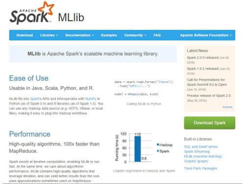 由于其速度,Apache Spark 成为一个最流行的大数据处理工具。MLlib 是 Spark 的可扩展机器学习库。它集成了 Hadoop 并可以与 NumPy 和 R 进行交互操作。它包括了许多机器学习算法如分类、回归、决策树、推荐、集群、主题建模、功能转换、模型评价、ML 管道架构、ML 持久、生存分析、频繁项集和序列模式挖掘、分布式线性代数和统计。