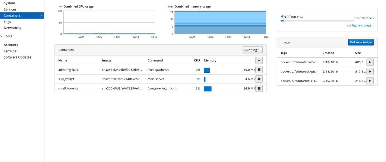 使用原子主机的登录信息或以 root 用户身份登录。然后访问 Cockpit 管理器上的 Containers 部分来查看原子主机上运行的容器。在下面的示例中,您会看到我还设置了其他容器,如 httpd 和 redis: