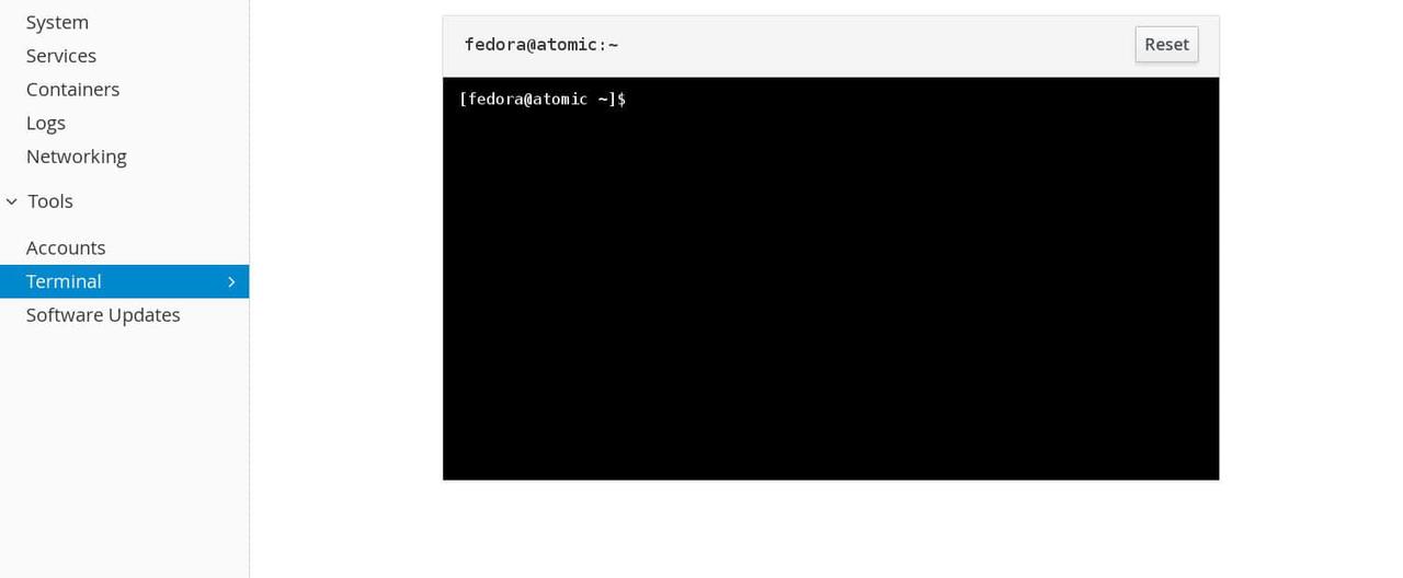 注意,该界面允许您直接在 Cockpit 管理器中使用 Run 和 Stop 按钮启动和停止容器。您还可以使用 Cockpit 管理器管理您的原子主机。转到 Tools -> Terminals,在这里里你可以使用原子主机的终端: