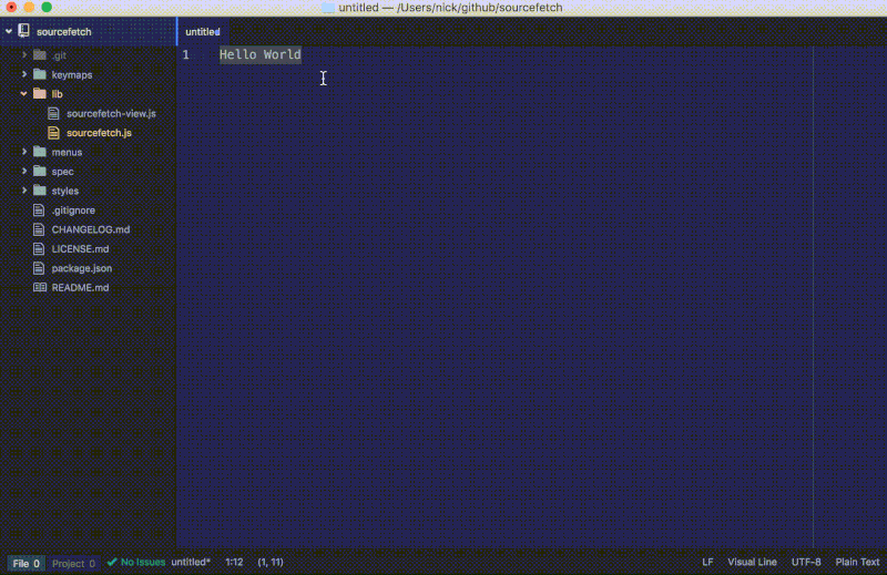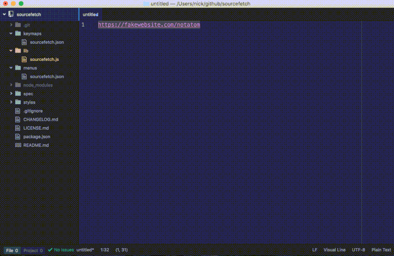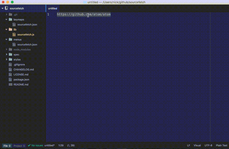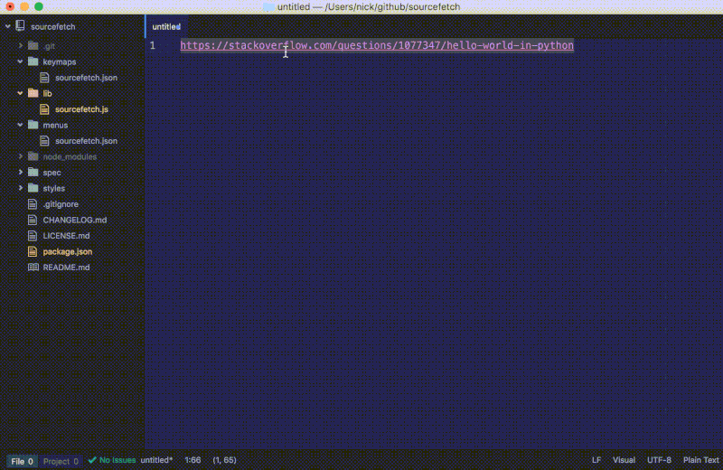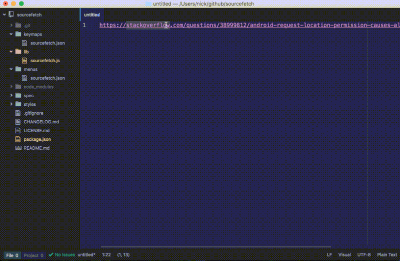重新加载 Atom 并在一个选中的 StackOverflow URL 上运行 soucefetch:fetch 以查看到目前为止的进度。