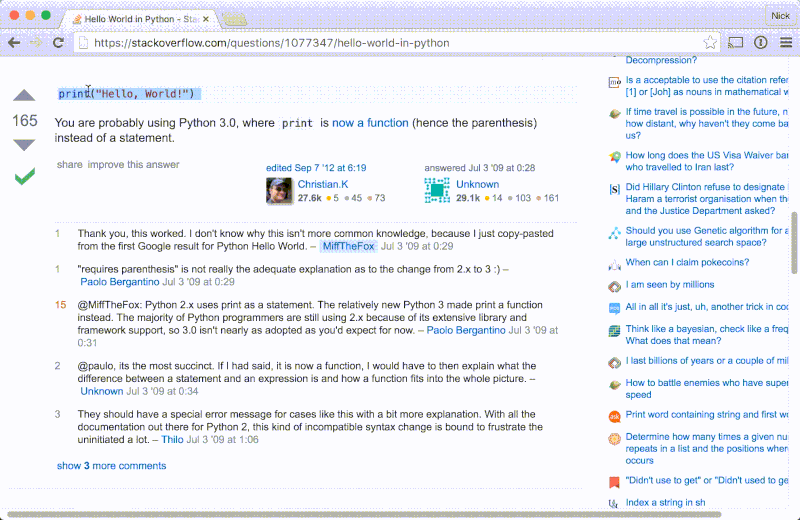 - 打开 Chrome 并跳到任意一个带有采纳答案和代码的 StackOverflow 页面,比如像这个用 Python 写的 hello world 的例子或者这个关于 用