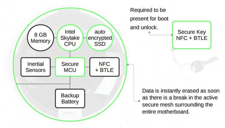 ORWL 使用自加密固态硬盘(SSD)。一个安全微控制器集成到其主板上来产生和存储加密密匙。一旦核实了系统的完整性和已验证用户,它就使用密匙来解密固态硬盘(SSD)。无论对 ORWL 进行任何类型的篡改,密匙都会立即删除固态硬盘(SSD)上的无用数据