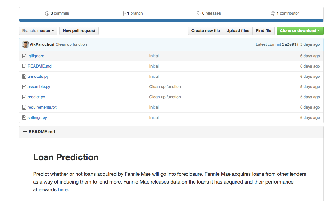 loan-prediction ├── data │ ├── Acquisition_2012Q1.txt │ ├── Acquisition_2012Q2.txt │ ├── Performance_2012Q1.txt │ ├── Performance_2012Q2.txt │ └── ... ├── processed │ ├── Acquisition.txt │ ├── Performance.txt │ ├── train.csv ├── .gitignore ├── annotate.py ├── assemble.py ├── predict.py ├── README.md ├── requirements.txt ├── settings.py