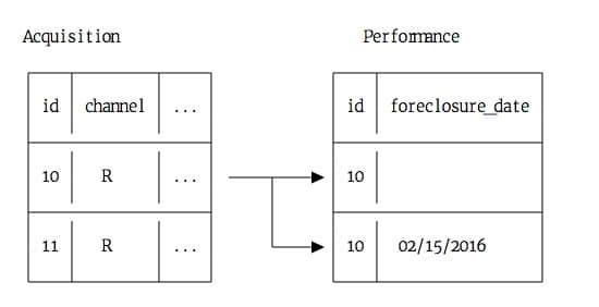 “贷款数据”是由房利美发布的贷款发放的数据,它包含借款人的信息、信用评分,和他们的家庭贷款信息。“执行数据”,贷款发放后的每一个季度公布,包含借贷人的还款信息和是否丧失抵押品赎回权的状态,一个“贷款数据”的“执行数据”可能有十几行。可以这样理解,“贷款数据”告诉你房利美所控制的贷款,“执行数据”包含该贷款一系列的状态更新。其中一个状态更新可以告诉我们一笔贷款在某个季度被取消赎回权了。