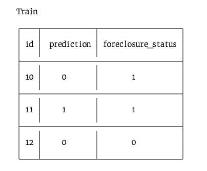 我们已经完成了训练数据表的生成,现在我们需要最后一步,生成预测。我们需要找到误差的标准,以及该如何评估我们的数据。在这种情况下,因为有很多的贷款没有被取消赎回权,所以根本不可能做到精确的计算。