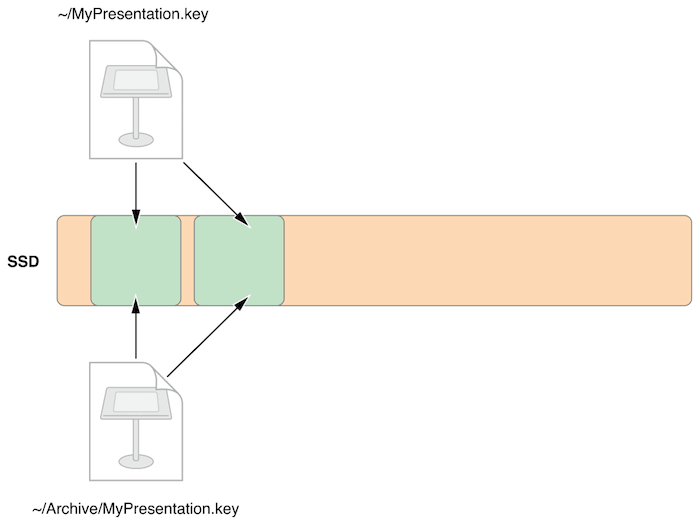APFS 使用称为写时复制(copy-on-write)的方案来生成重复文件的即时克隆。在 HFS+ 下,当用户复制文件的时候,每一个比特(二进制中的“位”)都会被复制。而 APFS 则通过操作元数据并分配磁盘空间来创建克隆。但是,在修改复制的文件之前都不会复制任何比特。当克隆体与原始副本分离的时候,那些改动(并且只有那些改动)才会被保存。