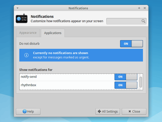 更近一步地,最新的 xfce-notifyd 包括了一个可以在单一应用基础上开启或关闭通知的选项。
