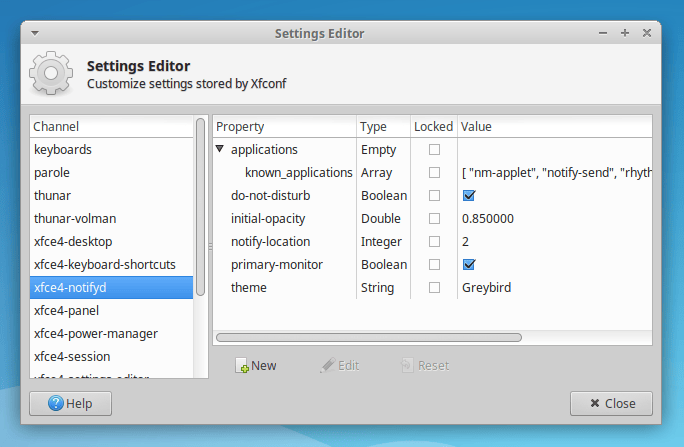 最后, xfce-notifyd 0.3.4 的另一个特性是选择在主监视器显示通知(直到现在,通知都是显示在当前监视器)。这个特性目前在图形设置界面里是没有的,必须使用 Xfconf(设置编辑)在 xfce-notifyd 下增添一个叫做 /primary-monitor(没有引号)的布尔属性,并设置为 True 来启用该特性: