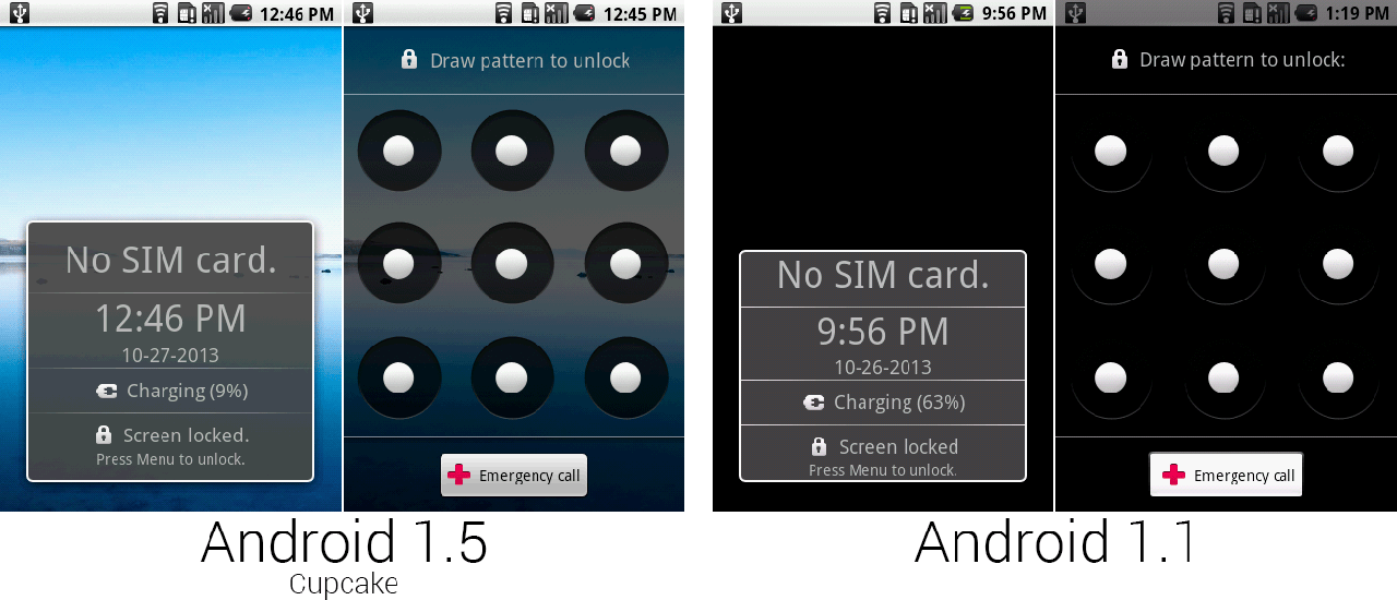 图形解锁界面的浅色背景显示出了谷歌在圆圈对齐工作上的草率和马虎。白色圆圈在黑圆圈里从来都不是在正中心的位置——像这样基本的对齐问题对于这一时期的安卓是个频繁出现的问题。