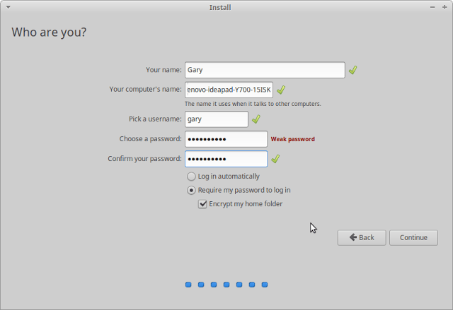 最后创建一个默认账户,输入你的名字、你计算机的名字、设置用户名和密码。