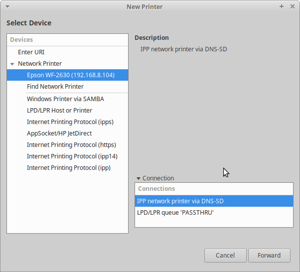 我有一个爱普生 WF-2630 无线打印机。 Xubuntu 能够直接找到这台打印机,并安装相关驱动。