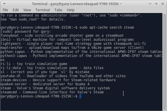 如果你使用命令行输入 sudo apt-cache search steam 你会发现有这个软件。