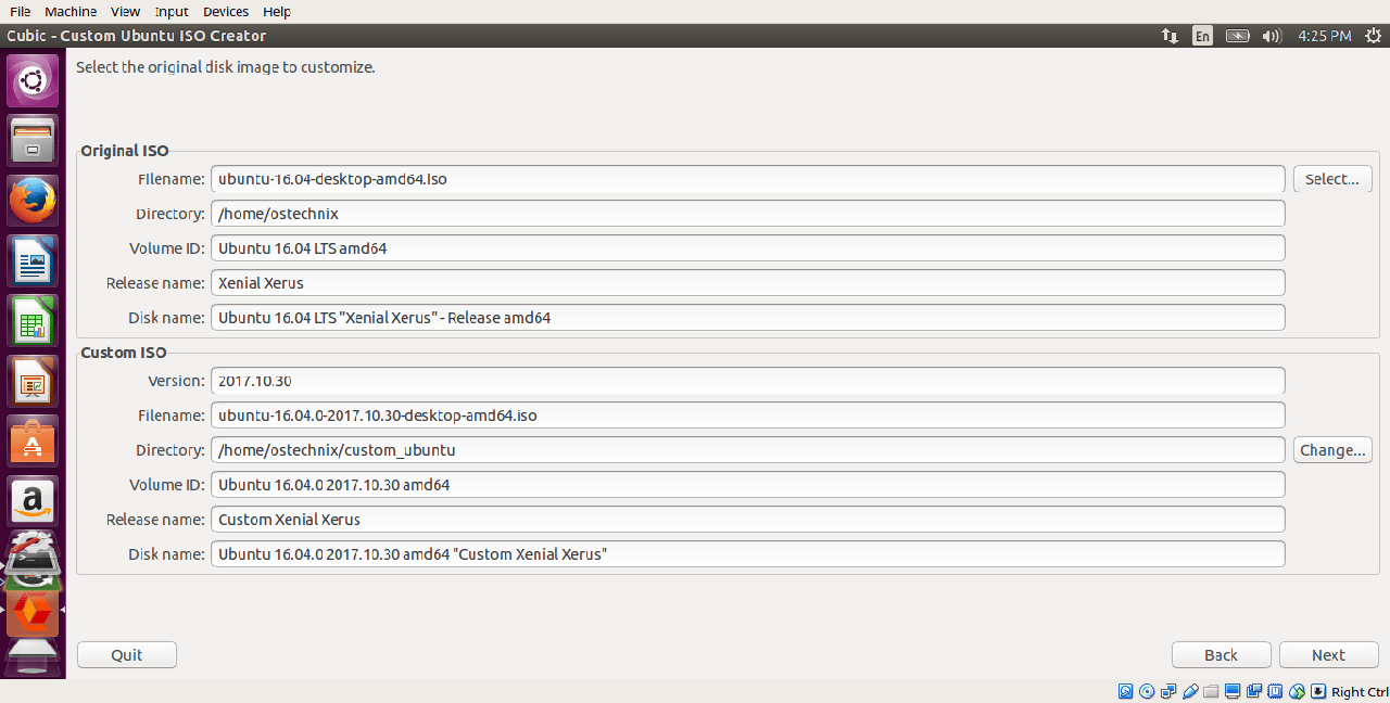 选择您存储 Ubuntu 安装 ISO 镜像的路径。Cubic 将自动填写您定制操作系统的所有细节。如果你愿意,你可以改变细节。单击 Next 继续。