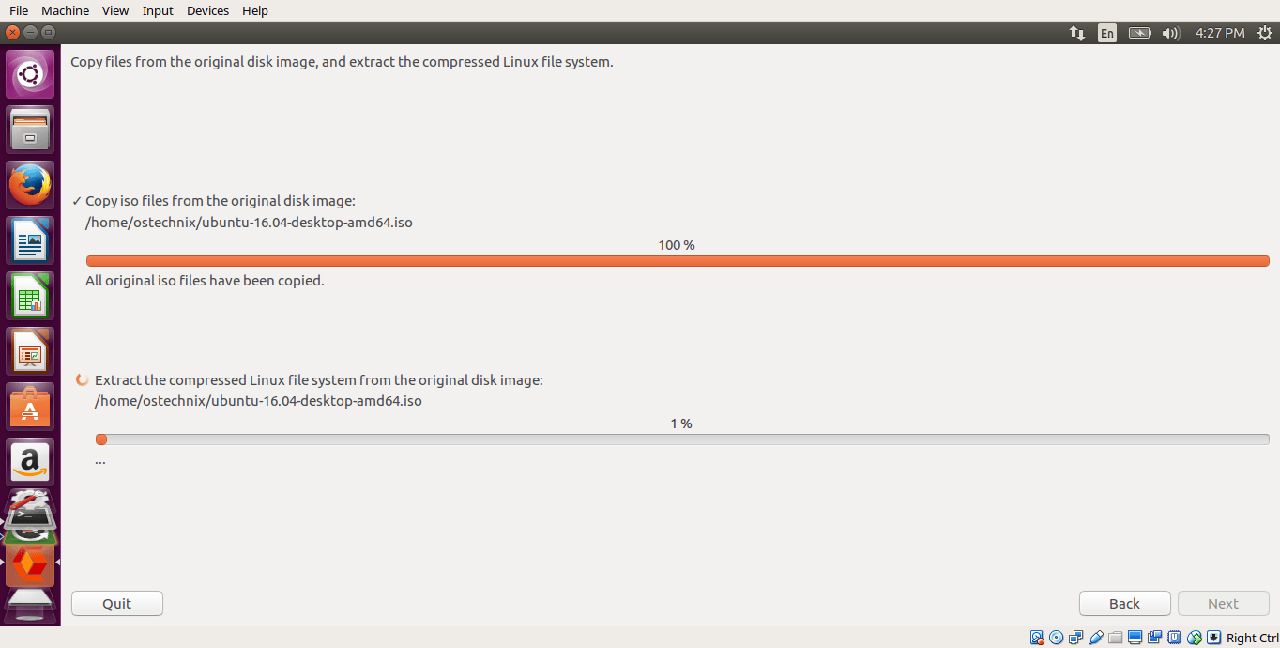 接下来,来自源安装介质中的压缩的 Linux 文件系统将被提取到项目的目录(在我们的例子中目录的位置是 /home/ostechnix/custom_ubuntu)。