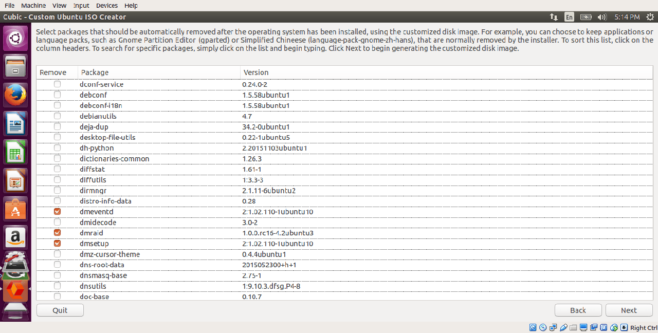 在下一节中,选择要从您的 Live 映像中删除的软件包。在使用定制的 Live 映像安装完 Ubuntu 操作系统后,所选的软件包将自动删除。在选择要删除的软件包时,要格外小心,您可能在不知不觉中删除了一个软件包,而此软件包又是另外一个软件包的依赖包。