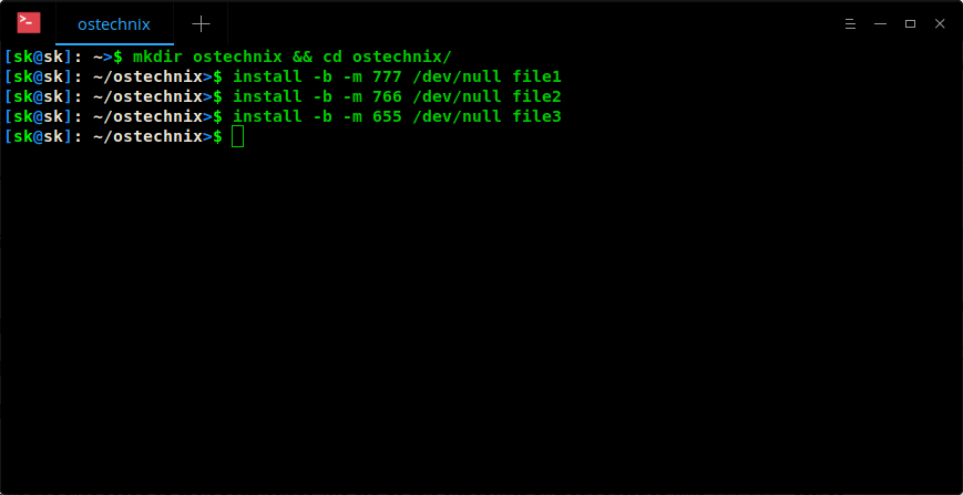 mkdir ostechnix && cd ostechnix/ install -b -m 777 /dev/null file1 install -b -m 766 /dev/null file2 install -b -m 655 /dev/null file3