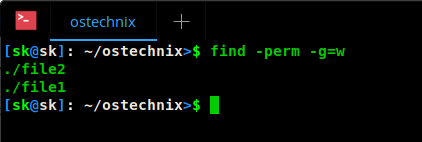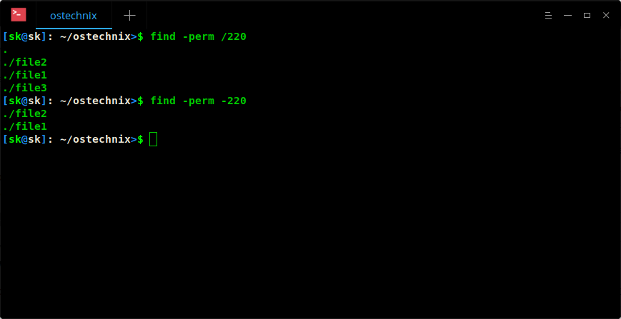 如你所见,命令行上显示两个文件。我们给 file2 设置了 766 权限,但是命令行显示两个文件,什么鬼?因为,我们设置了 - 参数前缀。它意味着这条命令将在所有文件中查找文件所有者的“读/写/执行”权限,文件用户组的“读/写”权限和其他用户的“读/写”权限。本例中,file1 和 file2 都符合要求。换句话说,文件并不一样要求时确切的 766 权限。它将会显示任何属于(高于)此权限的文件 。