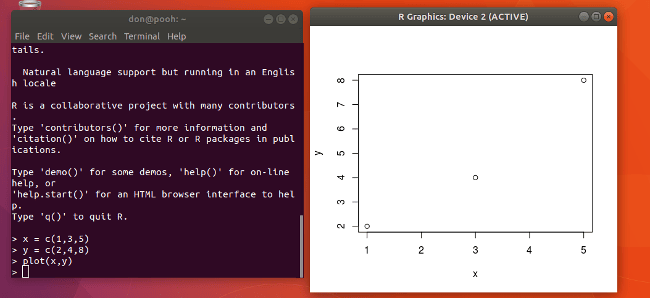 R 提供了一些很棒的演示例子,可以通过在提示符处输入 demo() 从控制台访问。demo(plotmath) 和 demo(perspective) 选项为 R 强大的功能提供了很好的例证。我尝试过一些简单的 vectors 并在 R 控制台的命令行中绘制,如下所示。