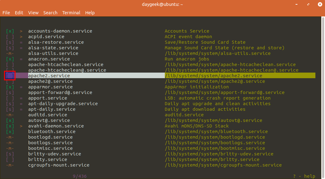 要查看帮助页面,按下 ?。 这将向您显示管理 systemd 服务的可用选项。