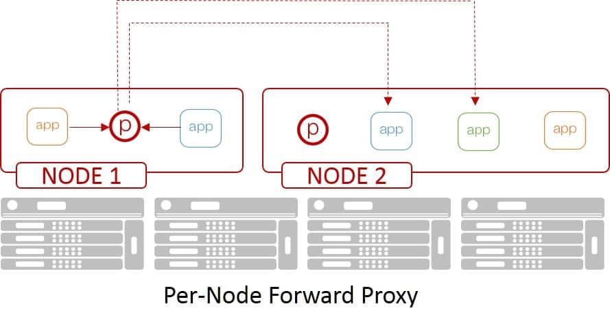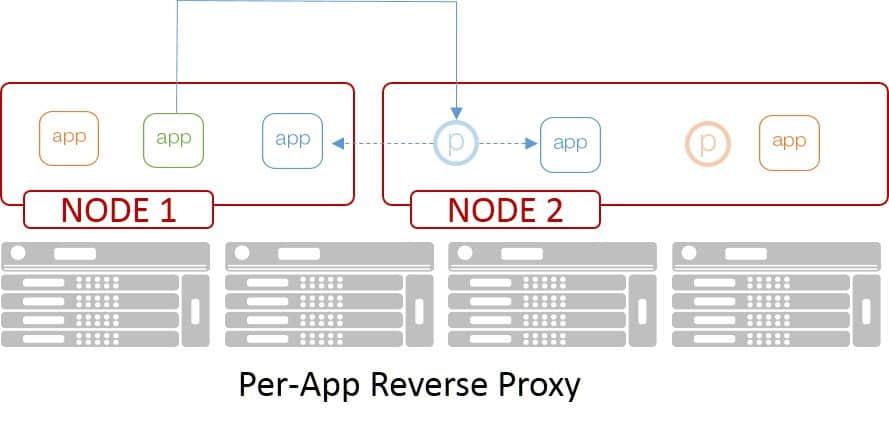 在这个模型中,每个容器 节点 都有一个关联的代理。如果客户端想要连接到特定的应用程序或服务,它将连接到正在运行的客户端所在的容器节点的本地代理。代理然后选择一个适当的应用实例,并转发客户端的请求。