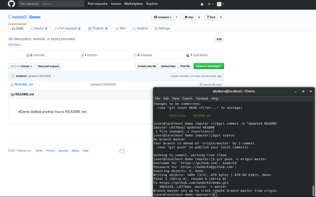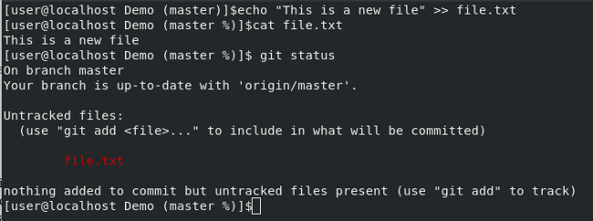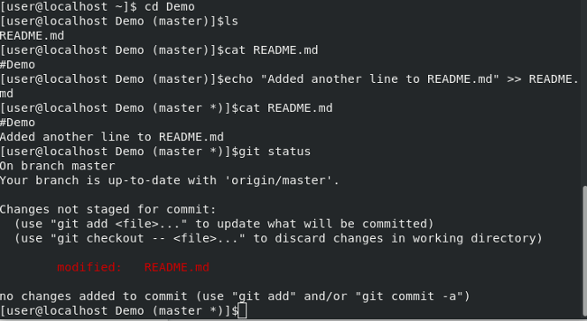cd Demo/ ls cat README.md echo "Added another line to REAMD.md" >> README.md cat README.md git status