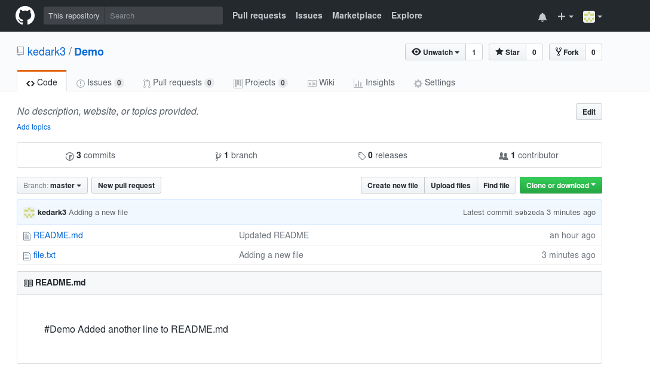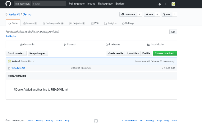 让我们克隆在上一篇文章中创建的名为 Demo 的仓库。(如果你还没有创建 Demo 仓库,请跳回到那篇文章并在继续之前执行那些步骤)要克隆文件,只需打开浏览器并导航到 https://github.com/<your_username>/Demo (其中 <your_username> 是你仓库的名称。例如,我的仓库是 https://github.com/kedark3/Demo)。一旦你导航到该 URL,点击“ 克隆或下载 ”按钮,你的浏览器看起来应该是这样的: