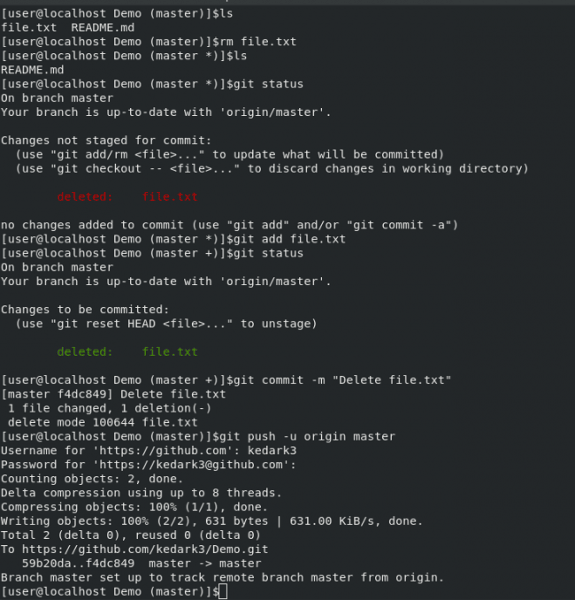 如果我们发现我们犯了一个错误,并且需要从我们的仓库中删除 file.txt,该怎么办?一种方法是使用以下命令从本地副本中删除文件: