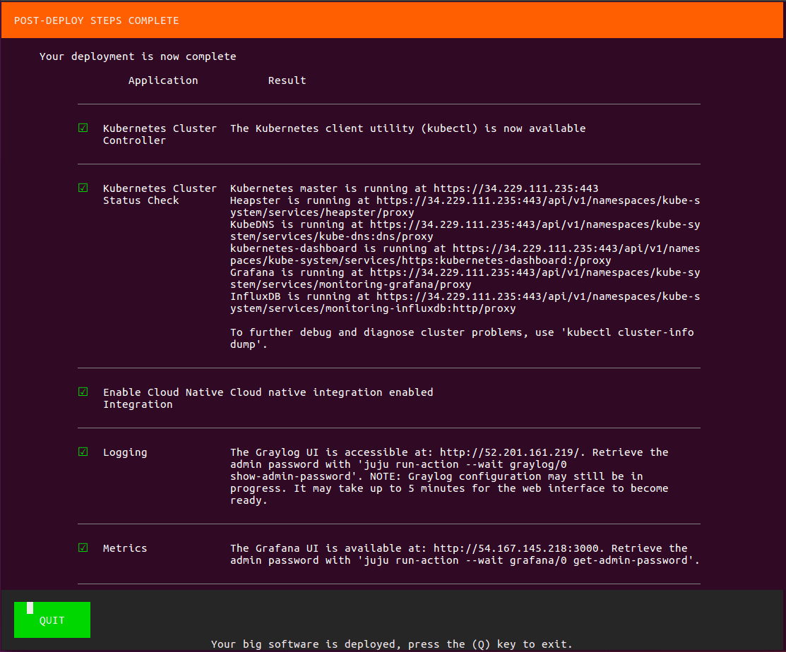 部署工作将花费一些时间,它将部署你的机器和配置你的云。完成后,conjure-up 将展示一个摘要屏幕,它包含一些链接,你可以用你的终端去浏览各种感兴趣的内容: