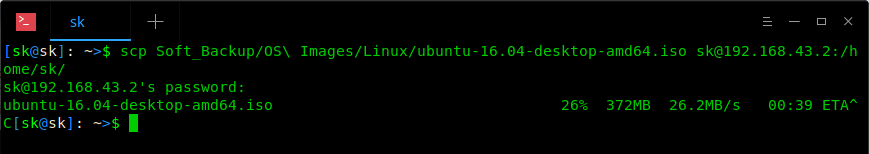 sk@192.168.43.2's password: ubuntu-16.04-desktop-amd64.iso 26% 372MB 26.2MB/s 00:39 ETA^c