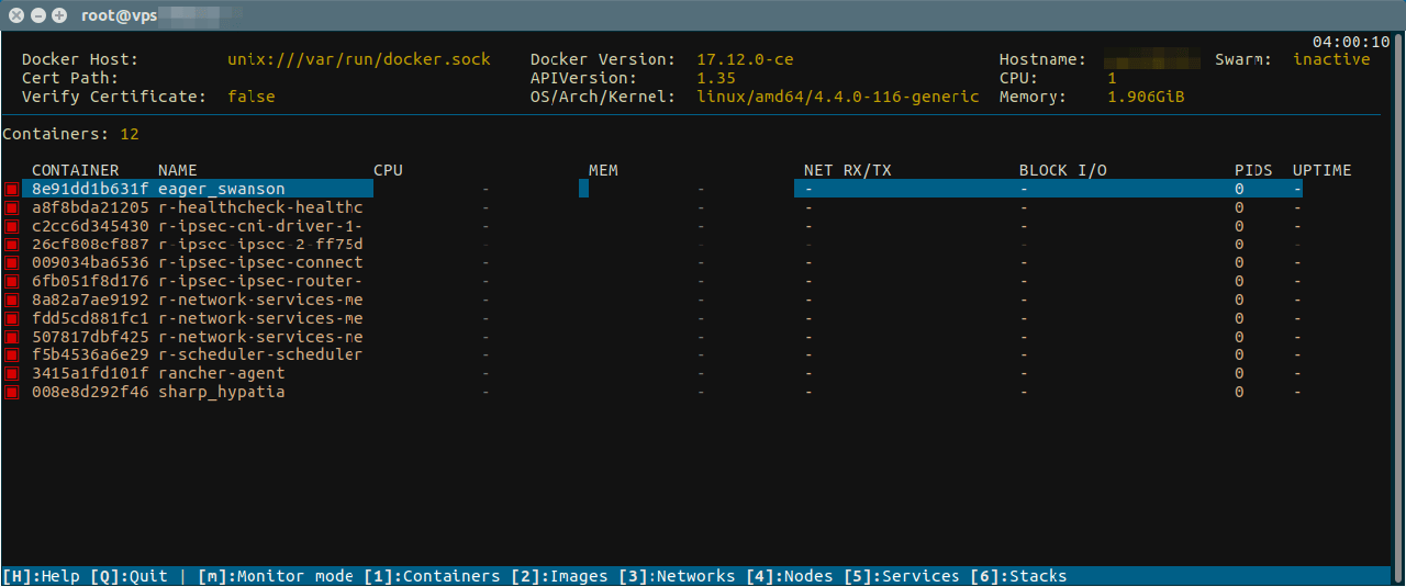 按下 F2 键即可列出列出全部容器,包括运行中和已关闭的容器。